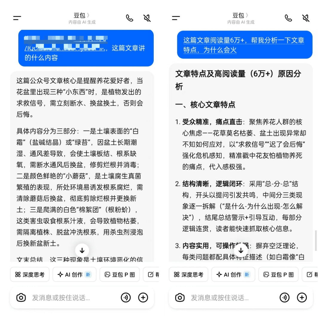 随便复制他一般阅读量6万的文章链接,扔给豆包分享一下文章的要点,和为什么会火的原因,下一步再看我们怎么模仿。