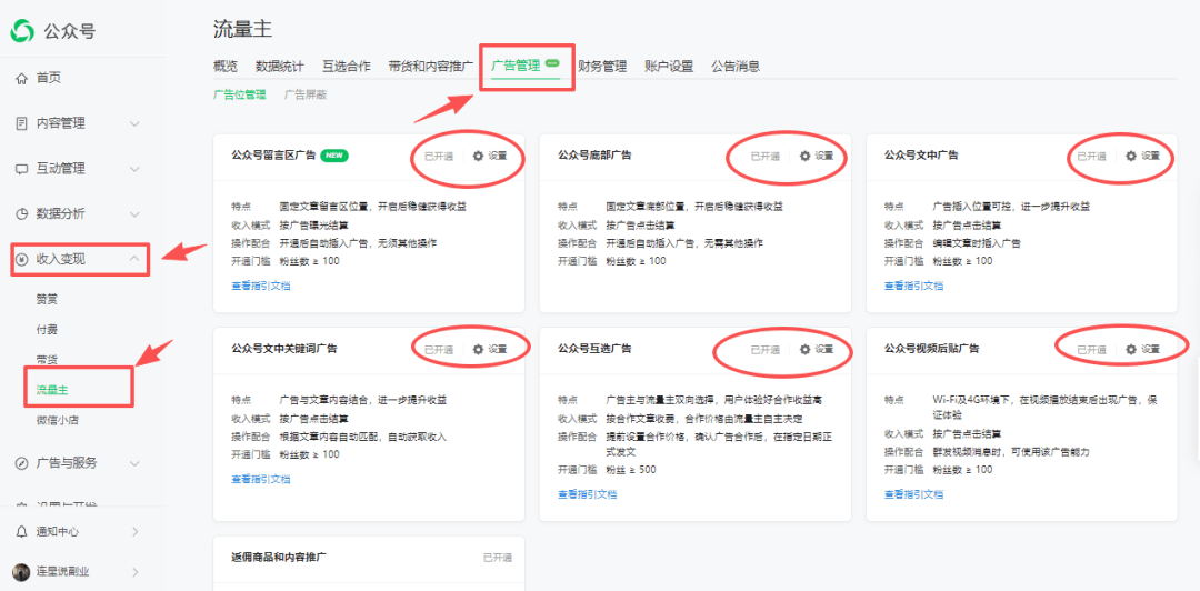 第三步:开通广告收益功能,及返佣商品功能(粉丝够 100 就能开)电脑登录公众号后台,左边菜单找「流量主」→ 点击「广告管理」,把版块内所有的功能全部打开。