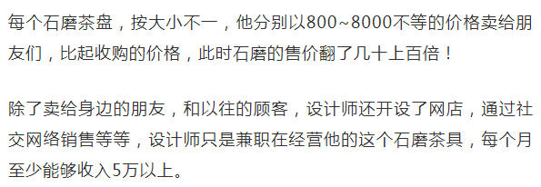 而设计师这类人,因为看上了石磨的独特,想到了改造成茶台这种产品,因此让其有了价值,而且关键是看到了茶市场的广大需求,里面充满商机。