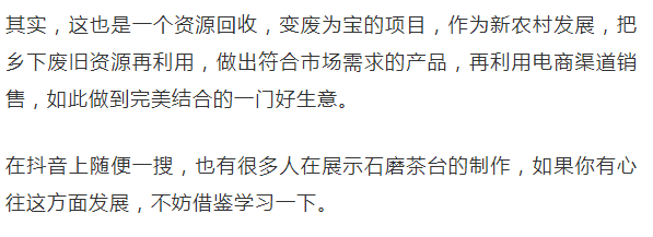 因此,农村很多看似废旧的资源,只要利用得当,也能重新焕发价值,一个石磨子回收价格不出百元,而加工打造成为一个茶台,却能够卖到几百上千元。