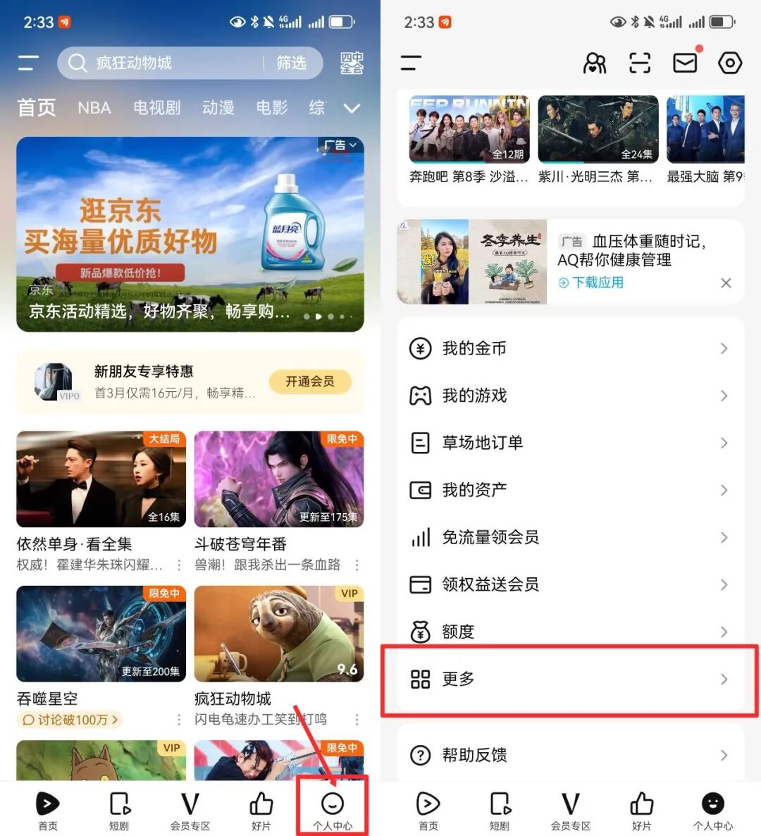登录进入后,点击右下角的【个人中心】,再点击【更多】。