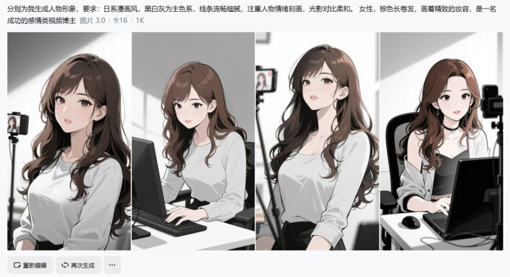 此时,我们的分镜脚本和文生图的提示词就生成啦,下一步用提示词生成图片。第二步:生成主角形象这里因为即梦AI在图片生成上效果更好,所以我们使用即梦AI进行生图。结合我的文案,故事的主角为网红女与IT男,结合两者的形象,输入提示词获取主角形象。