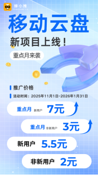 准备工作超简单,两步就能搞定,新手不用紧张。第一步,获取正规推广资格:打开官方授权平台——【蜂小推】,用手机号注册后搜索“移动云盘”,按提示提交基础信息申请推广权限,申请通过后领取专属推广链接,全程零费用。第二步,准备基础物料:不用原创资源,找现成的刚需资源包即可,比如职场PPT模板、考研真题、0-6岁育儿绘本,选一类人群的资源打包,上传到自己的移动云盘备用;再准备1张资源截图,方便推广时展示,提升吸引力。