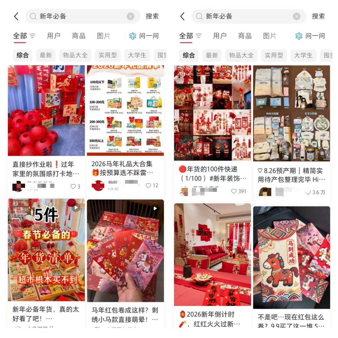 以小红为例,假如我们做网上的项目,不知道该干点啥,就搜这个关键词:新年必备,来看一下,排在前面的笔记都是什么内容。