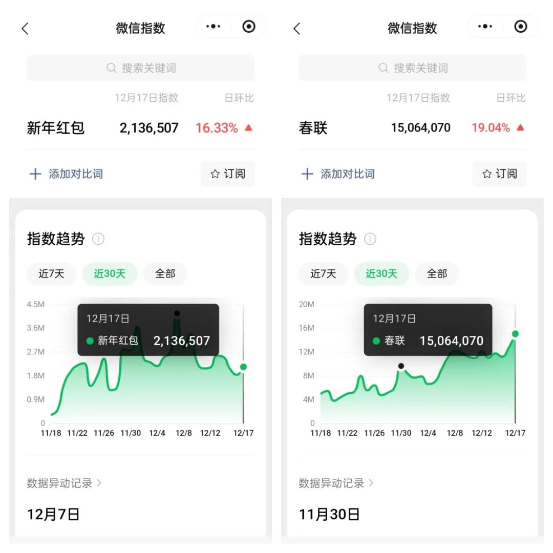 手机打开微信,搜索微信指数,就能找到这个工具,我们分别查询春联和新年红包这两个关键词,可以看到数据。