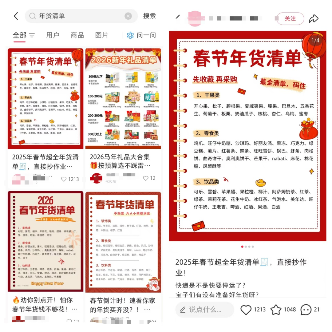 第二个问题,如果开实体店,不知道进什么货,我们可以用同样的方法在小红书搜索关键词:年货清单,就可以看到别人种草的内容了。