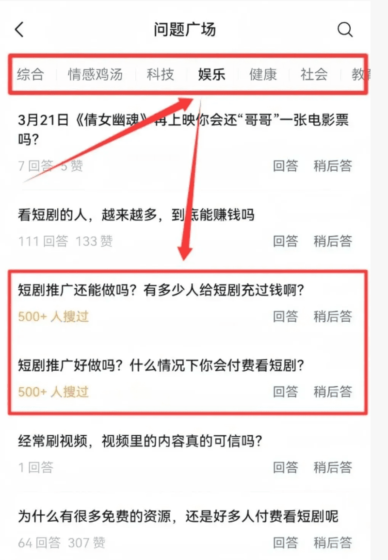 新手建议选自己熟悉的领域回答,回答得越垂直,流量越精准,越容易被推流。比如说你想做职场类,问答广场都分好类了,点进去挑问题回答就行。尽量选【300 + 人搜过】的问题,流量好,容易出爆款。