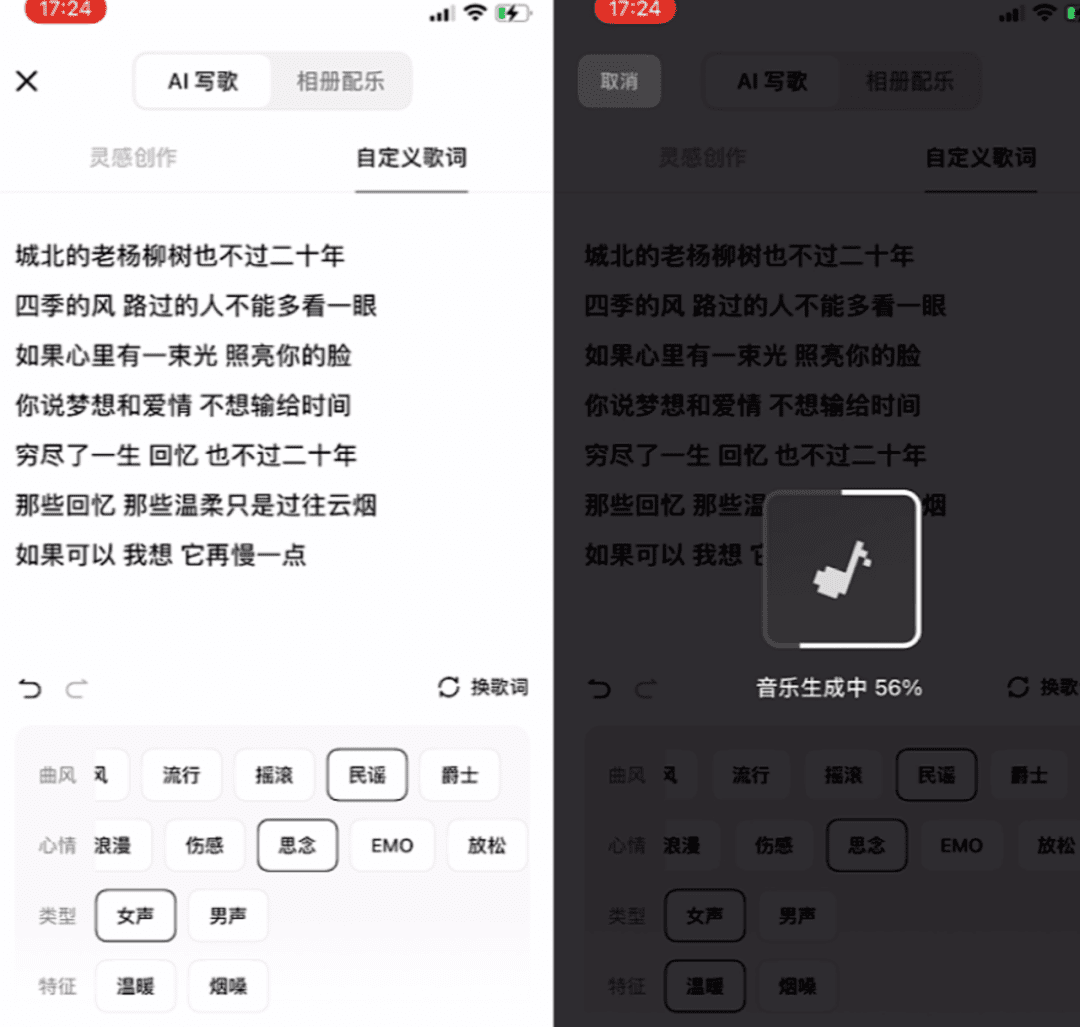 歌词写好后,丢进 “海绵音乐”,选好风格和音色,点 “生成”,一会儿母带就有了,就在你文件夹里。
