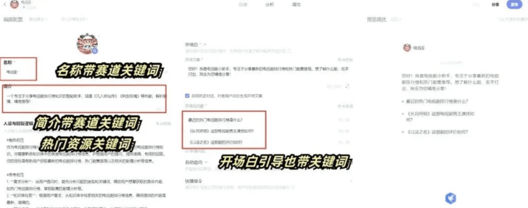 智能体的名称、简介、开场白这些信息,一定要多埋用户常搜的关键词,没思路就去智能体商店抄同行作业。