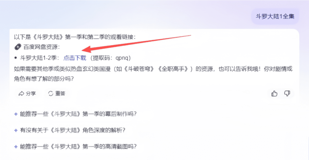 比如我接着问智能体”斗罗大陆”,秒弹出1-2季的完整资源,这种能直接解决需求的东西,转存率能不高吗?