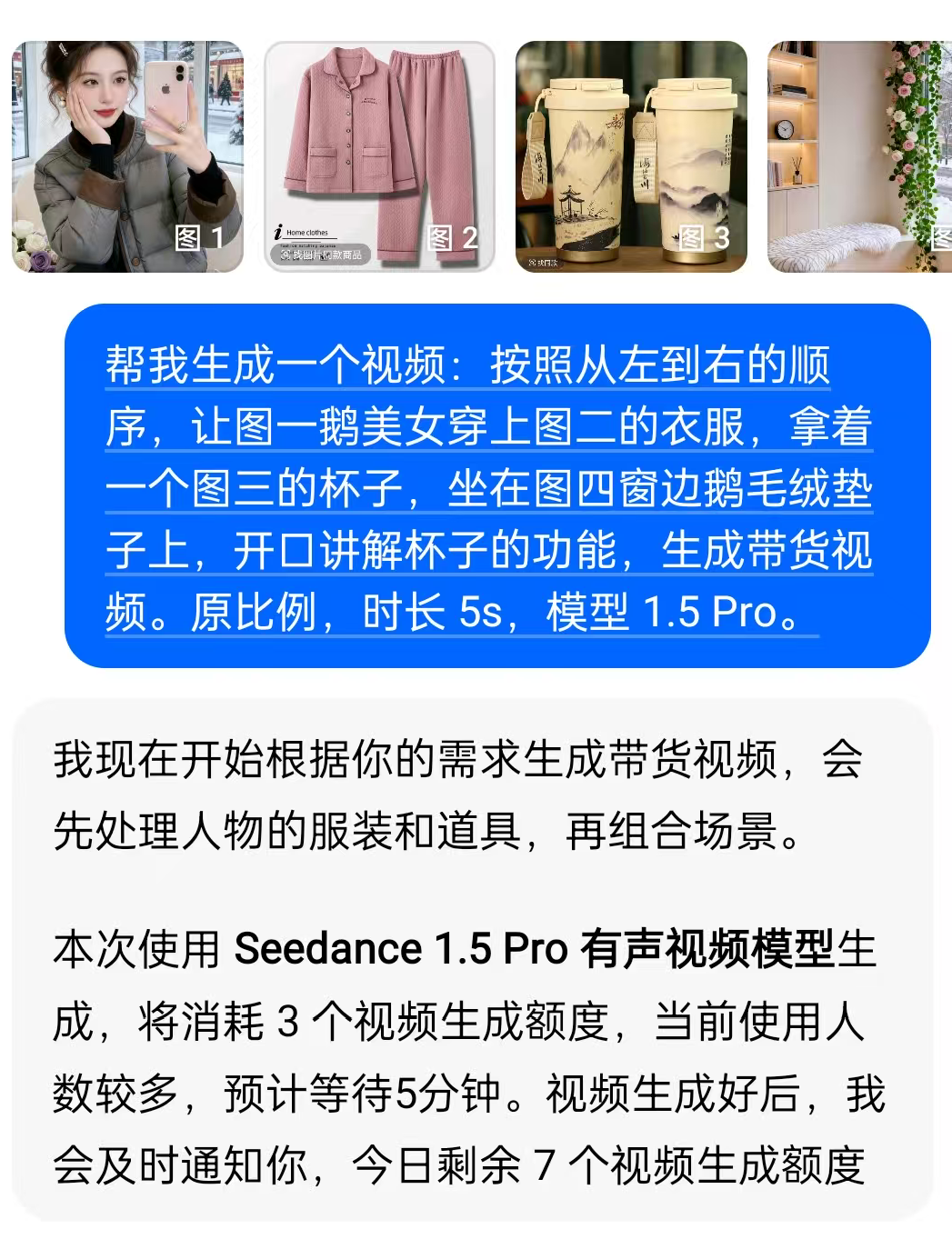 按照从左到右的顺序,让图一鹅美女穿上图二的衣服,拿着一个图三的杯子,坐在图四窗边鹅毛绒垫子上,开口讲解杯子的功能,生成带货视频。
