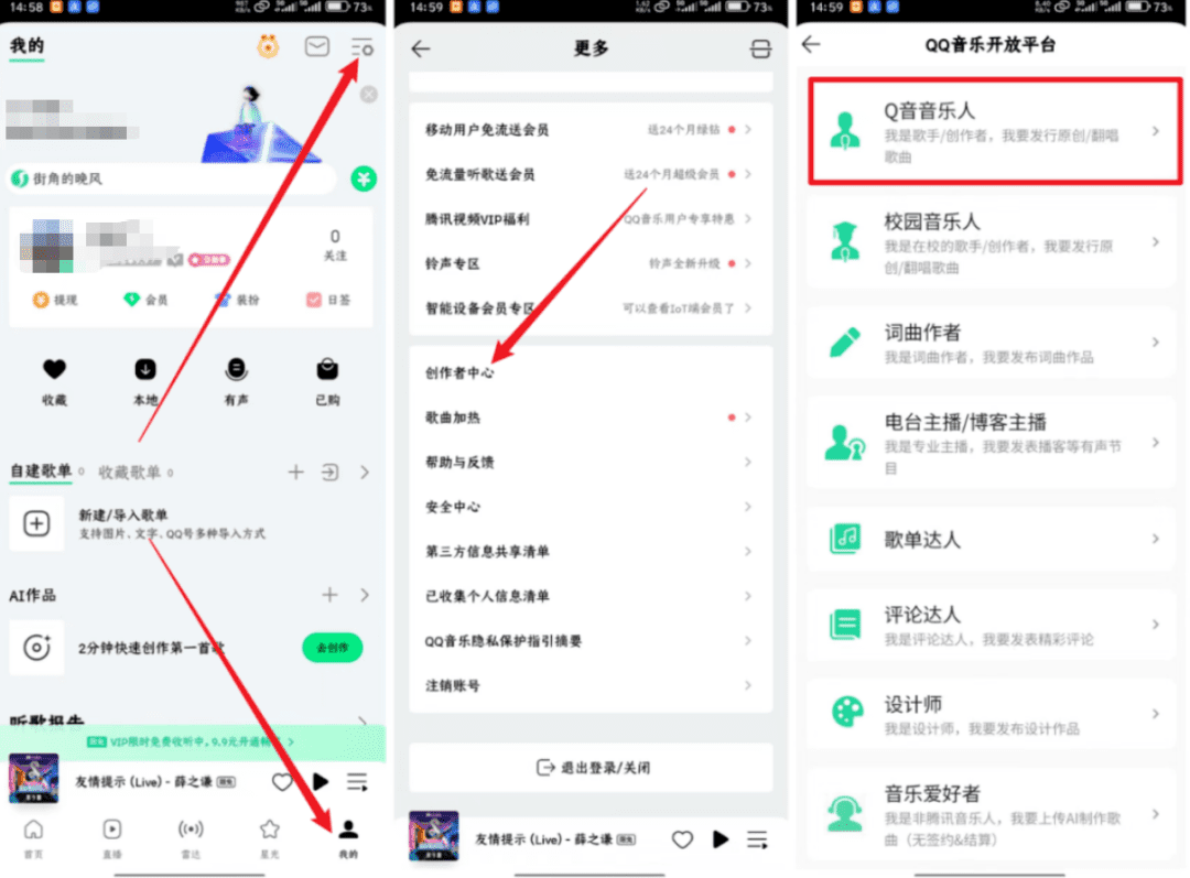 登录成功以后依次点击:“我的”-“右上角三条杠”“创作者中心”,就可以看到“申请音乐人”了。