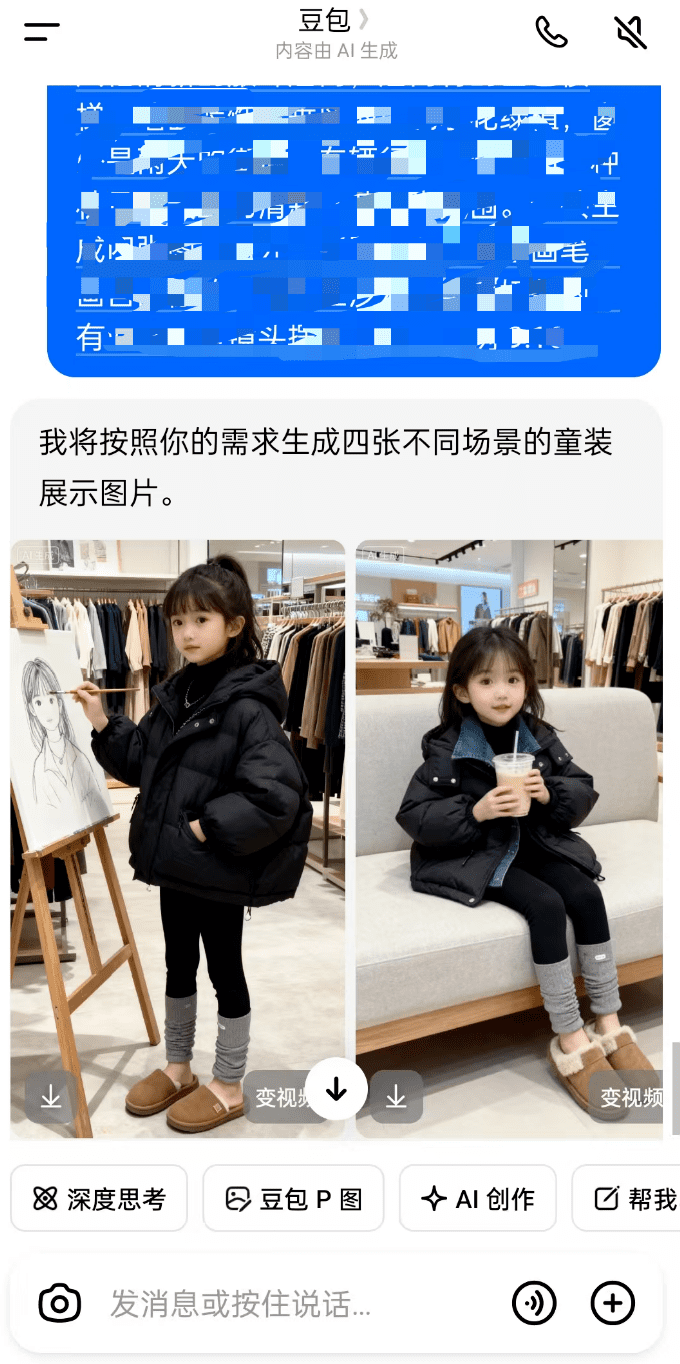 例如我这张图片打开豆包并上传这个图片作为参考图,然后复制我们的提示词,点击生成,提示词一次是可以生成四张不同的图的