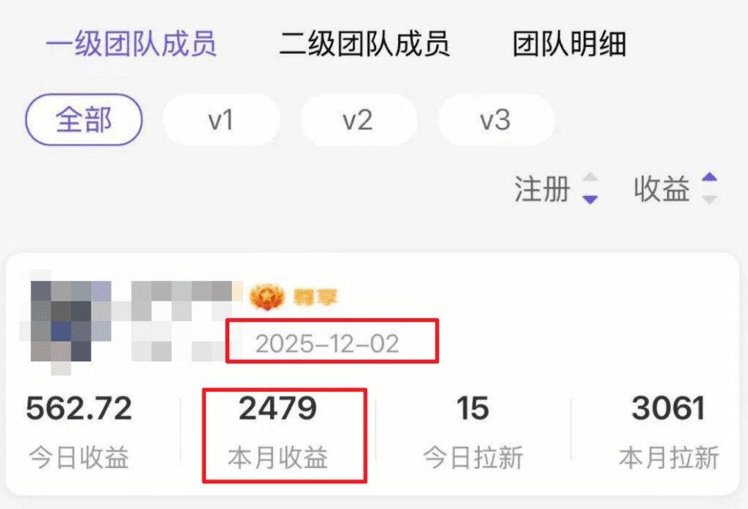 我留意到他的一个团队一级成员,注册时间是12月2日,到现在为止差不多一个月左右,累计收益已经有2000+。
