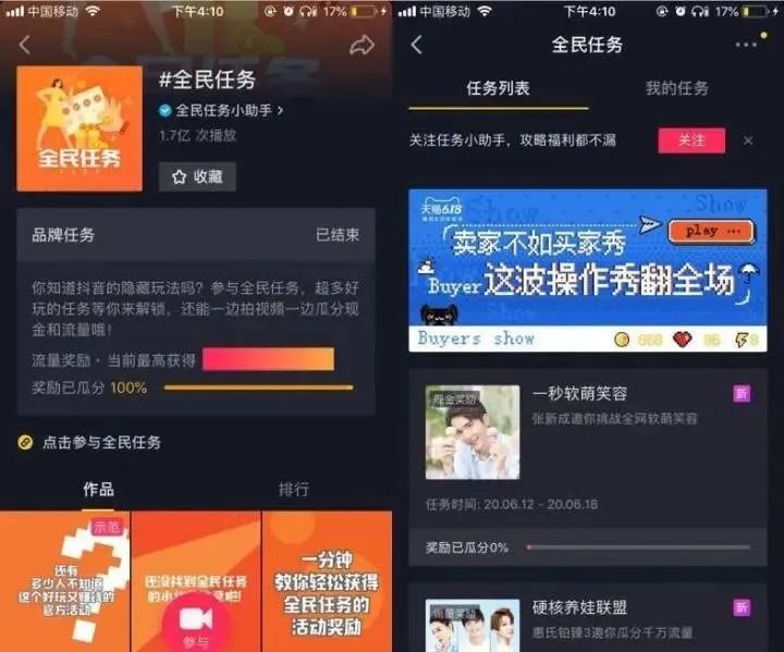 在抖音搜索全民任务,或者在创作者中心里面找到全民任务即可进入,按照任务的要求,艾特相关账号,带上相关话题,不用直播,不用卖货,看播放量多少你就有多少收益,最关键的是它没有门槛。0粉丝就可以做。