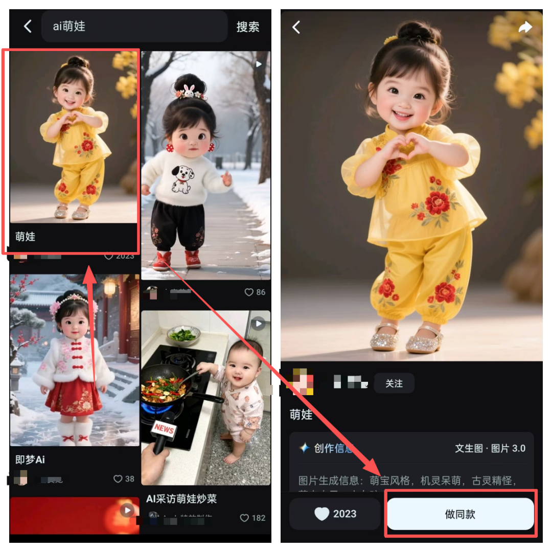 首先手机安装一个即梦APP,然后搜索AI萌娃,选择自己比较喜欢的形象以后,点击下方的做同款。