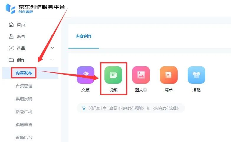 打开京东创作服务平台,进入【创作】—【内容发布】。选择【视频】,上传你的作品,坐等出单。