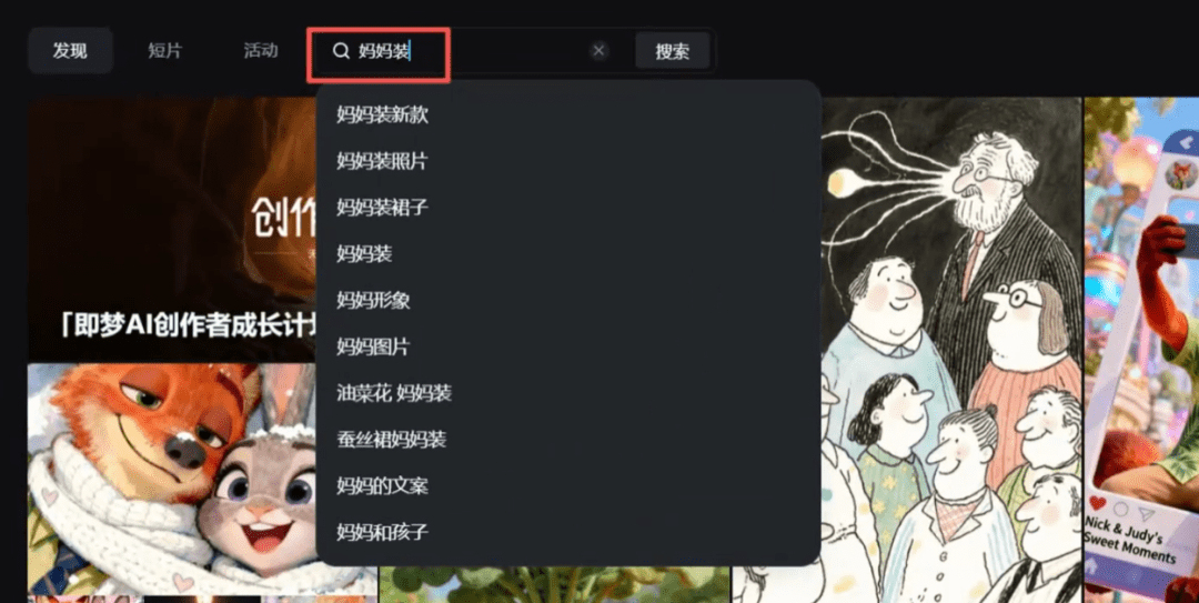 接下来就是最核心的部分,教你怎么用AI制作带货图片我们先找素材,即梦首页直接搜妈妈装,随便挑一张你觉得顺眼的图,点右下角做同款。