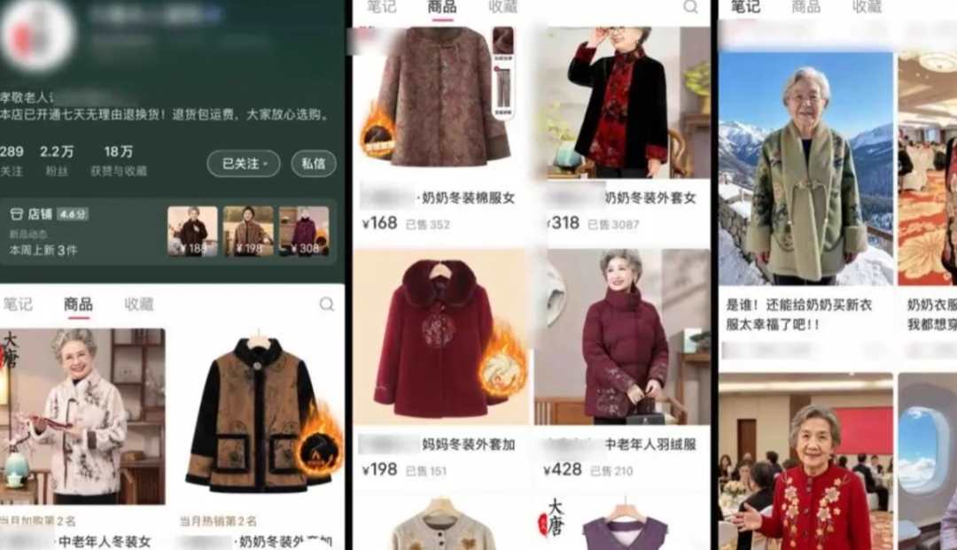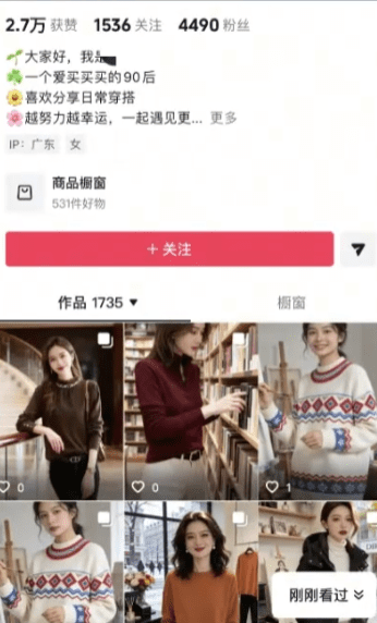 这些账号都是一个共性,就是作品内容简单粗暴,只发中老年女装一个品类,死磕到底,作品全部都是AI生成的,图文一条带四张图,再配上几个标签,挂上购物车,就这么简单。