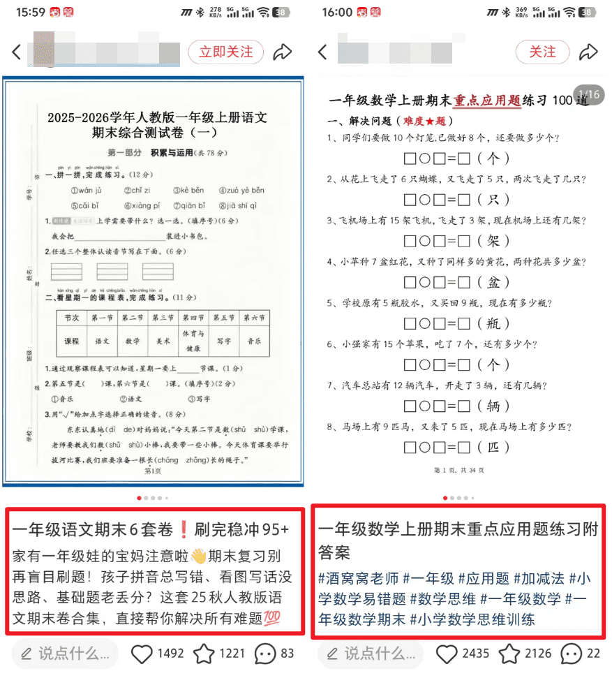 1. 打开你准备好的某一份学习资料(比如一份试卷)2. 用手机截图功能,截4-6张有代表性的内容3. 拼成一张图或者做成图片轮播4. 写一个简单的标题,比如”三年级数学期末必考题型,给孩子打印出来做一遍”5. 文案不用写太多,3-5行说清楚这份资料的价值就行6. 加上相关话题标签:#小学数学 #期末复习 #学习资料7. 发布