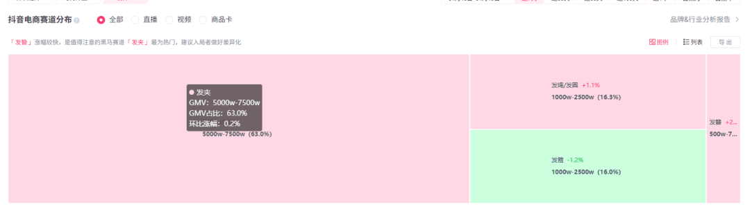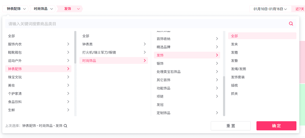 大赛道点进去,还能查看这个类目下细分赛道的数据,比如我想卖发饰,可以在类目这里查看发饰下的所有数据情况: