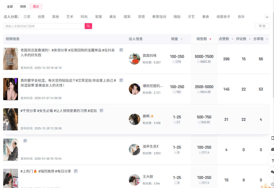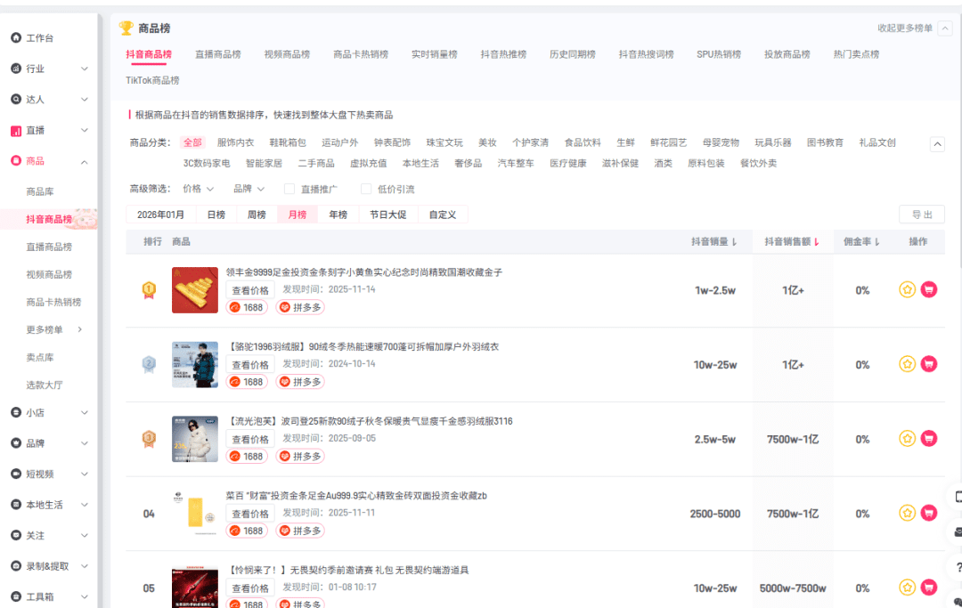 筛选出你要做的商品类别,并按照销量排序,就能看到具体的商品,点进去后就能看到这个商品相关联的内容或达人。