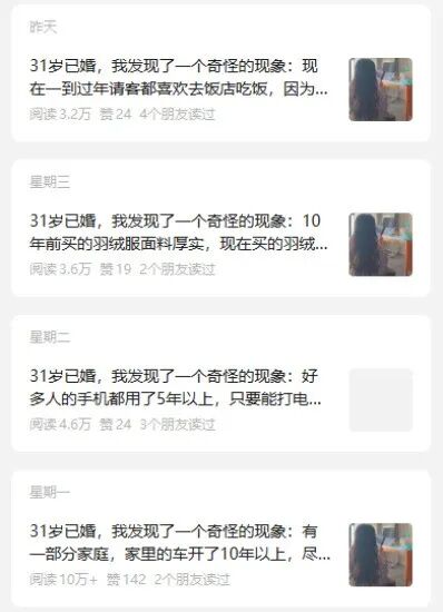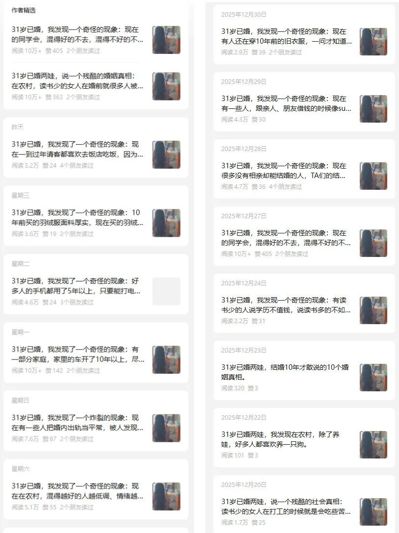 再看第二个账号,定位细分到了”31岁”和”已婚”,这样能吸引到更多同频、同性别、同年龄段的人。这样的账号粉丝定位更精准,虽然看起来人群范围受限,但阅读两反而比较高,平均一周能出一条10万+的大爆款。