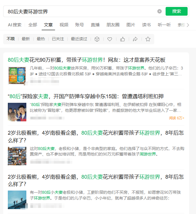 打开微信的”搜一搜”,比如搜索”夫妻”,选择文章、最近7天、最热,就可以找到很多优质的同行账号。一定要找个人低粉账号作为对标,粉丝量高的大V账号对于我们没有任何参考价值。