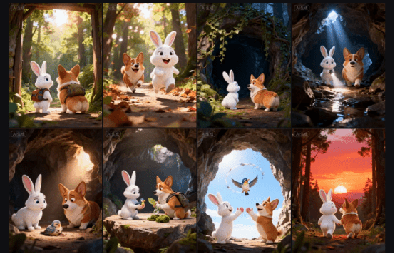 提示词:3D皮克斯风格,森林深处,小兔子和柯基发现了一个神秘的洞穴。