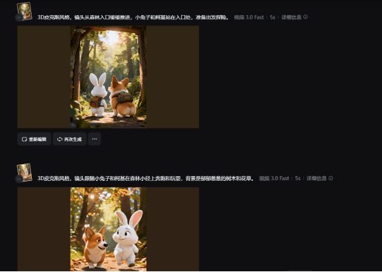 提示词:3D皮克斯风格,森林小径,小兔子和柯基快乐地玩耍。