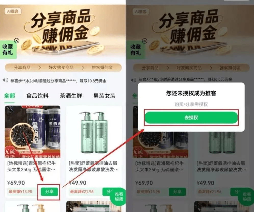 进去之后,只需要授权微信就可以登录这个平台了,进去之后,我们可以看到,平台里面都是各种各样的商品,除了有商品介绍和价格之外,还有分享和佣金。