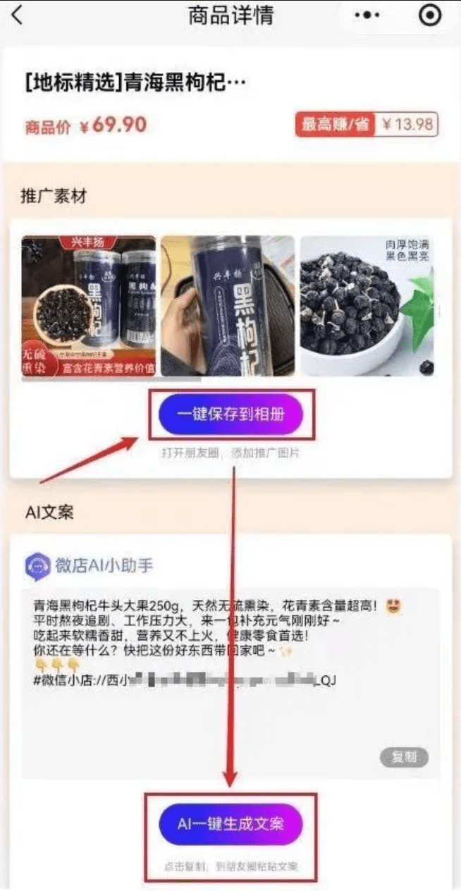 申请完了之后,选择我们需要分享的商品,它就会给到你素材和文案了,整体操作还是挺丝滑的。