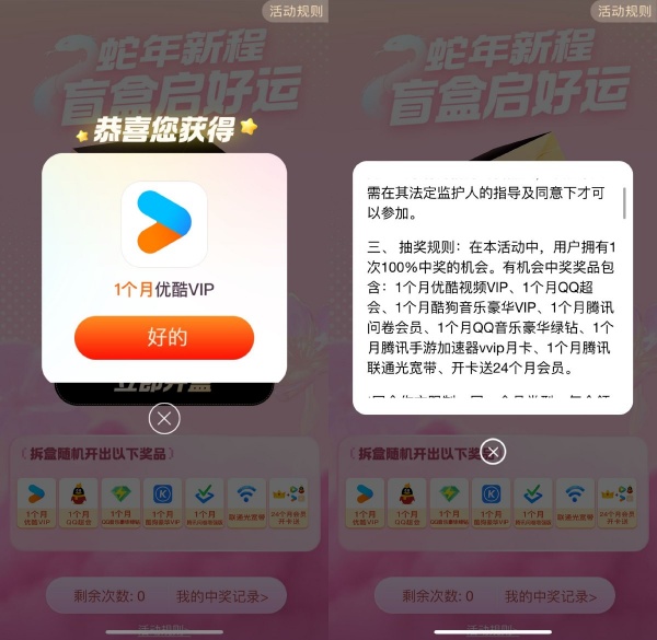 正文 联通蛇年新程开盲盒,抽各类会员月卡 项目推荐 V评论者 /02-20 /370 阅读 0220 联通王卡举办的蛇年新程2月盲盒启好运活动,打开微信进去小程序活动里,全国三网手机号码都可以抽1次,联通号码的概率会稍微大点,有机会中到QQ超级会员、优酷会员、QQ音乐会员、酷狗音乐会员月卡,小编测试中到1个月优酷会员秒到,非必中。 微信扫下面码进入活动: 活动时间:2025年2月17日-3月31日 进入活动页面全国三网号码都可以抽1次,联通号码的概率会稍微大点,刚中1个月优酷会员,非必中。 投诉/删帖