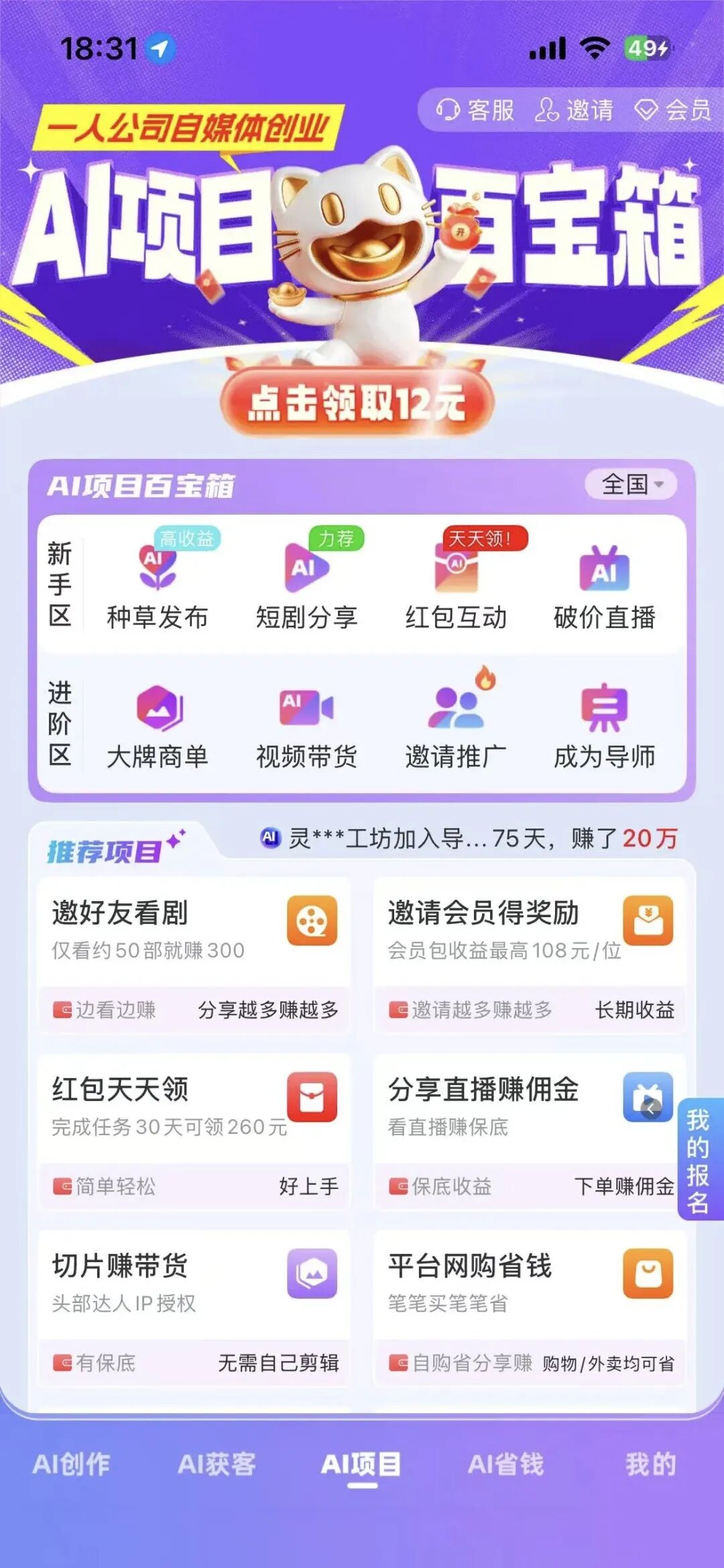 爱创猫:一款集ai创作,种草,广告赚米的综合型平台,0撸项目,日收益100左右!