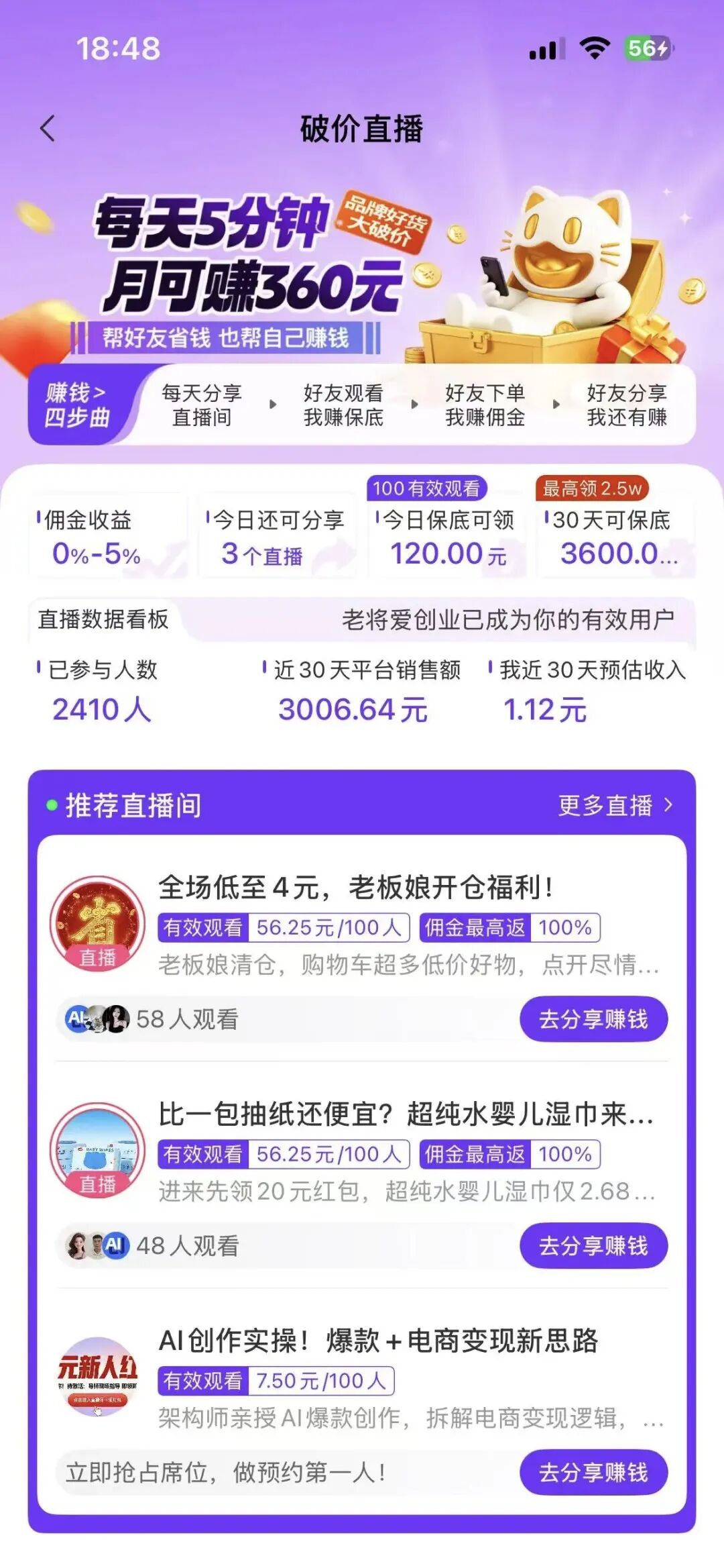 直播专区就是一些挂有小黄车的带货直播间,进去看几十秒会弹一个优惠券,有用得上的自己也可以买。你也可以分享直播间,你或好友观看满5分钟,可以获得直播收益;你或好友在直播间下单,均可获得返利收益。