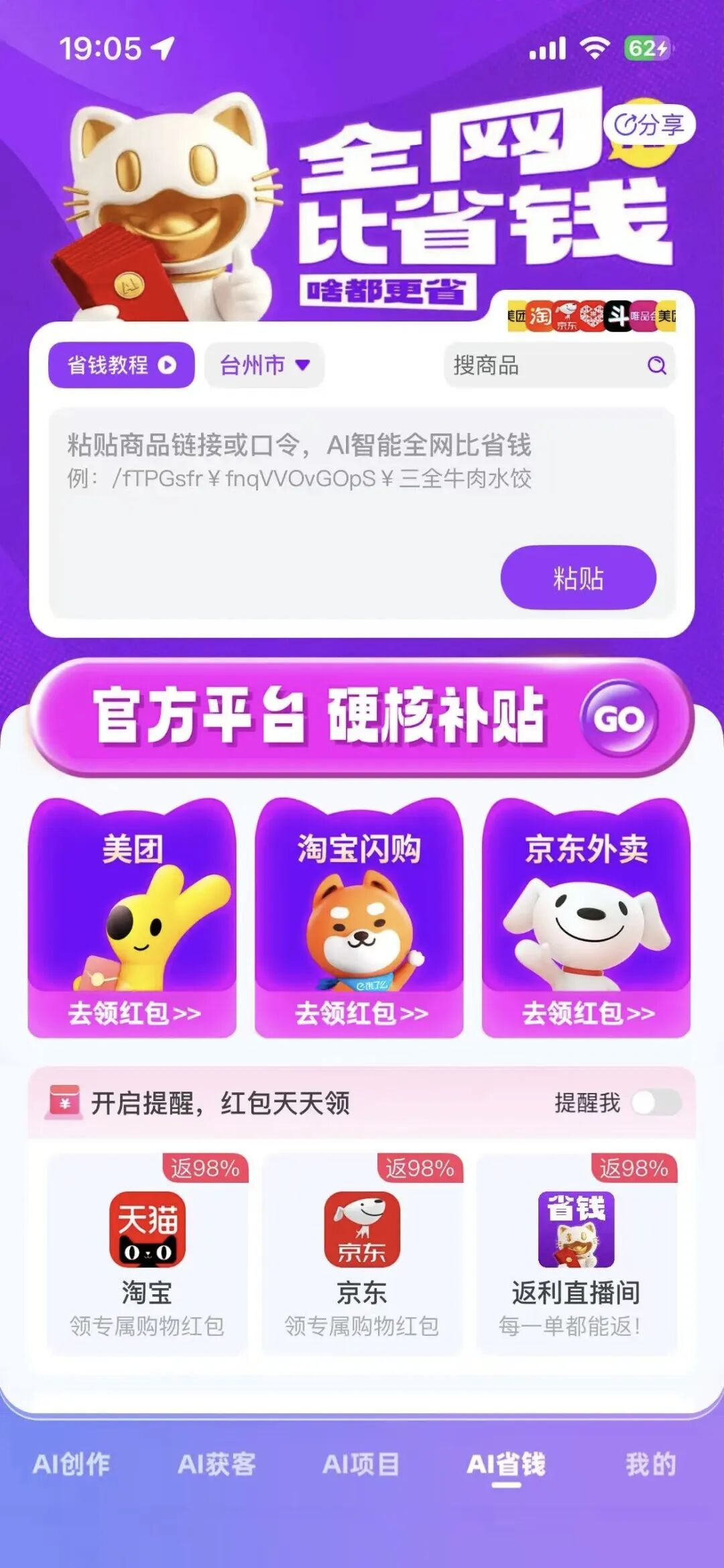 AI省钱,就是你如果想买一个东西,你可以复制链接或口令,粘贴到这里来,它会自动获取优惠信息并进行一个平台比价,最终确定一个最划算的方案给你。