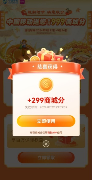 和包举办的疏朗时节快意秋分简单领最高999个和包积分活动,打开和包APP进去活动里,进去登录后会自动抽奖1次,有机会中到最高999个和包积分(价值10元左右),小编测试中到299个和包积分(价值3元左右),累积得到的和包积分可以在商城里面兑换云闪付红包、美团外卖红包等等。