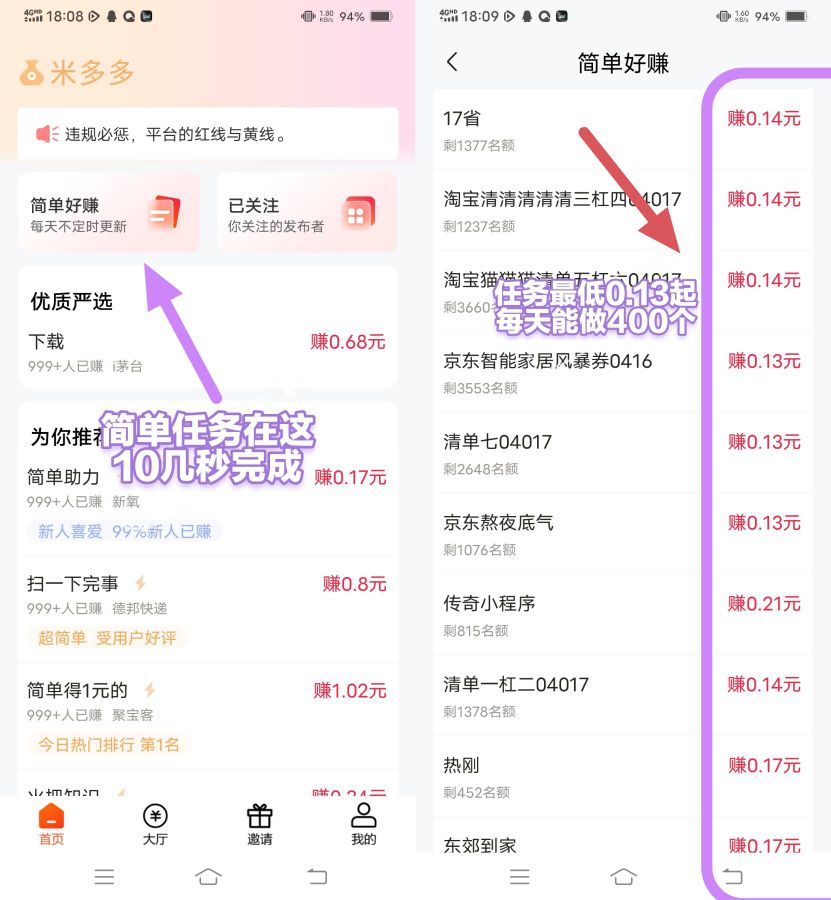 正文 米哆哆 任务简单 轻松零撸 wang5le V评论者 /01-15 /0 评论 /402 阅读 0115 米哆哆(米多多)是一款专门为想赚零花钱的人设计的APP。每天只需完成一些简单任务,比如助力、点赞、关注等,十几秒就能搞定。这些任务不仅操作简单,而且数量充足,每天花点零碎时间,就能轻松赚到20多元。对于那些时间不多但又想赚点外快的人来说,米哆哆无疑是一个非常合适的选择。 平台主打 微信关注 小程序 单价高 一单0.17 每天可以重复做。任务每天重复做 强烈推荐复制网址浏览器下载或浏览器扫码下载http://ma.shangduobao.pro/mdz-28277426投诉/删帖