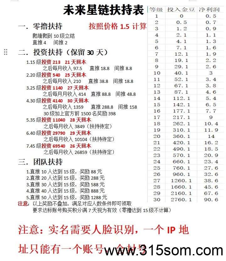 正文 星链一战,集体上岸,全网火爆预热中 58 V管理员 /05-21 /371 阅读 0521 星链一战,集体上岸 全网火爆预热中 上半年干星途,下半年干星链。 错过星途不要错过星链[社会社会] 基本都是排队进场,激活码有限。 未来星链项目优势 1:项目没有充值通道 2:项目没有资金池 3:模式全新,完美闭环,0门槛加入,享受稳定收益。 4:项目可持续性造血,生态强大,内外循环。 5:金豆开盘定价1.5,每日上涨 6:永远不锁仓,本金随进随出。 7:团队奖励,直推25%,间推15% 投诉/删帖