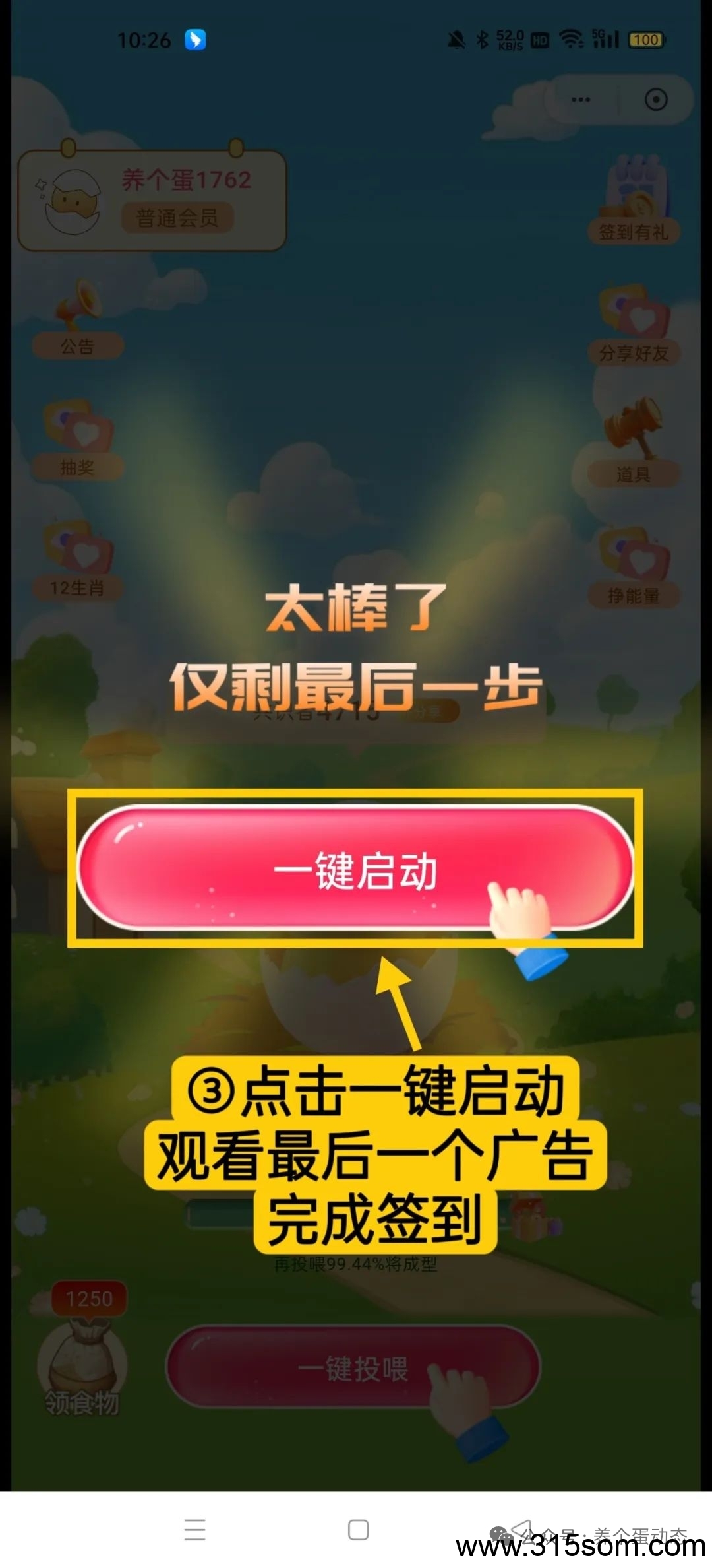 正文 养个蛋最新黑马项目!圈圈加十二生肖养成全新玩法! zhuzi123 V评论者 /05-24 /371 阅读 0524 养个蛋最新黑马项目!圈圈加十二生肖养成全新玩法!养个蛋-如何连续签到获得巨额奖励 步骤一:来到养个蛋页面点击一键领养生肖步骤二:依次点击六个金蛋观看六个广告获得六次奖励步骤三:点击一键启动完成签到步骤四:点击一键投喂(每四小时投喂一次 养成生肖获得奖励)步骤五:点击签到有礼查看连续签到天数连续签到三天可获得抽奖机会(100%中奖)连续签到七天可获得巨额奖励投诉/删帖