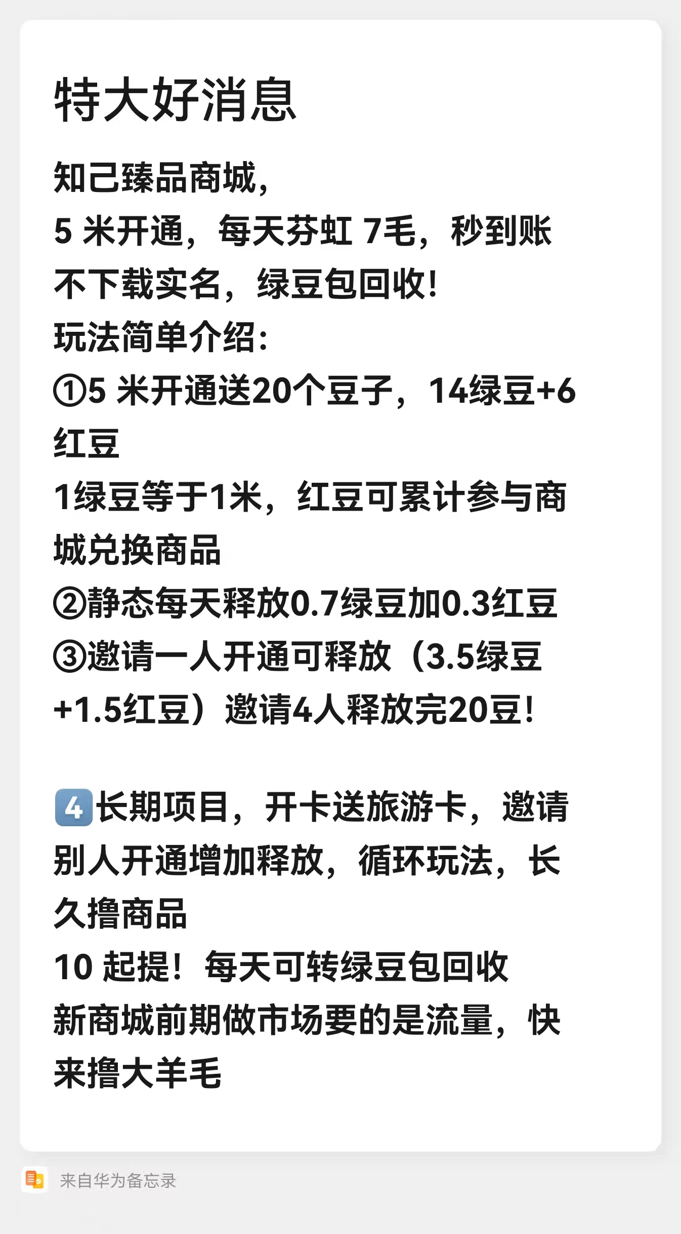 正文 知己商城:5元开启暴富时代新平台,秒踢秒到,轻松赚米+ 超赞 V评论者 /09-14 /0 评论 /156 阅读 0914 首码上线已知商城,新商城前期做市场要的是流量,快来撸大羊毛5米开通,每天芬虹 7毛,秒到账不下载实名,绿豆包回收!玩法简单介绍:①5米开通送20个豆子,14绿豆+6红豆1绿豆等于1米,红豆可累计参与商城兑换商品②每天释放0.7绿豆加0.3红豆③邀请一人开通可释放(3.5绿豆+1.5红豆)邀请4人释放完20豆!4️⃣重新下单5米开通送20豆子,重新增加释放,循环玩法,长久撸大米+商品10 起提!每天可转绿豆包回收客服V:SCSF-MoXiong投诉/删帖