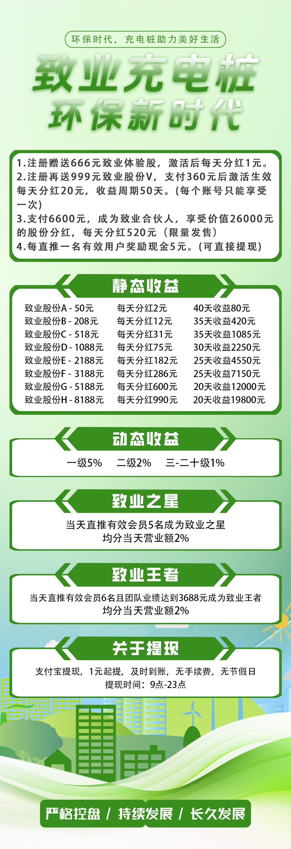 1.注册赠送666元致业体电桩,激活后每天分红3元(永久生效)