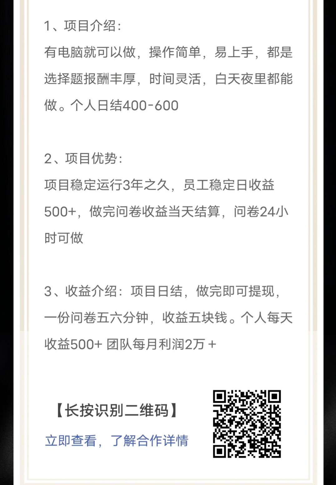 正文 答题挣米,纯计件项目,多劳多得.单人日结400-600米 rnm22222 V评论者 /09-28 /0 评论 /118 阅读 0928 1、项目介绍:有电脑就可以做,操作简单,易上手,都是选择题报酬丰厚,时间灵活,白天夜里都能做。个人日结400-600!2、项目优势:项目稳定运行3年之久,员工稳定日收益500+,做完问卷收益当天结算,问卷24小时可做!3、收益介绍:项目日结,做完即可提现.一份问卷五六分钟,收益五块钱。个人每天收益500+ 团队每月利润2万 +【长按识别二维码】立即查看,了解合作详情投诉/删帖