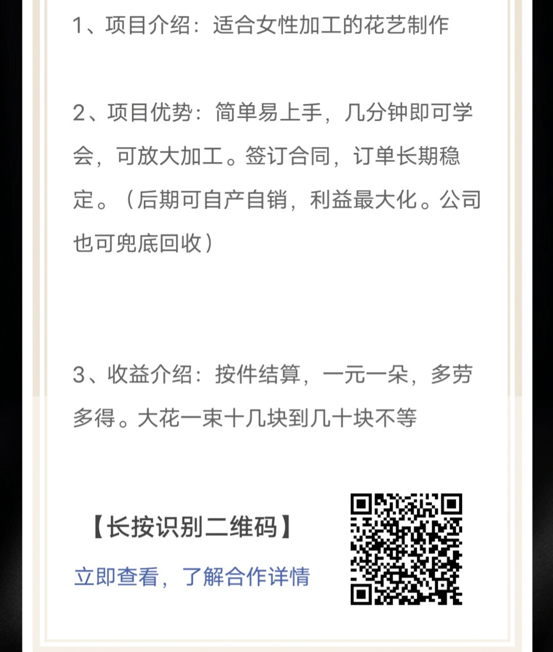 正文 手工永生花!易上手。人均260+ rnm22222 V评论者 /10-01 /0 评论 /112 阅读 1001 1、项目介绍:适合女性加工的花艺制作!2、项目优势:简单易上手,几分钟即可学会,可放大加工。签订合同,订单长期稳定。(后期可自产自销,利益最大化。公司也可兜底回收)3、收益介绍:按件结算,一元一朵,多劳多得。大花一束十几块到几十块不等【长按识别二维码】立即查看,了解合作详情投诉/删帖