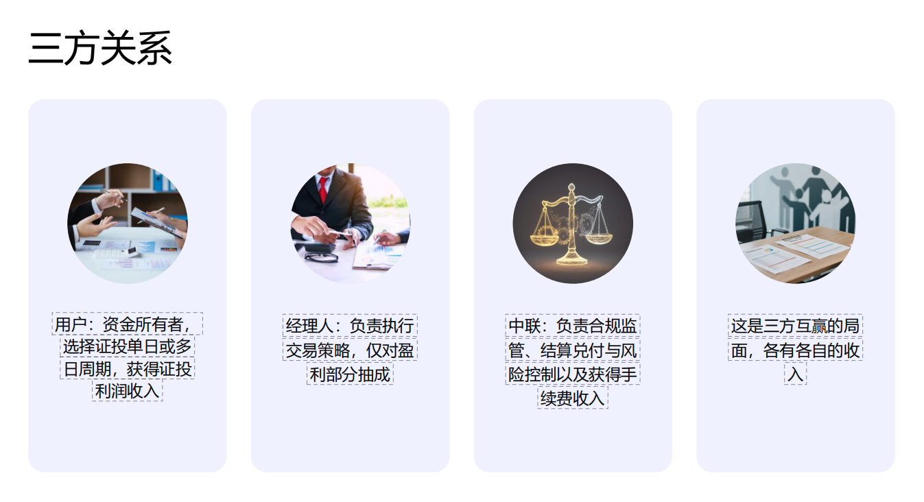 证投服务简介,证投(证券投资委托)是指用户通过中联平台,将资金用于申请证投,由证投经理人及操盘团队执行交易策略模型买入股票,卖出股票后按盈利结果进行分成结算。