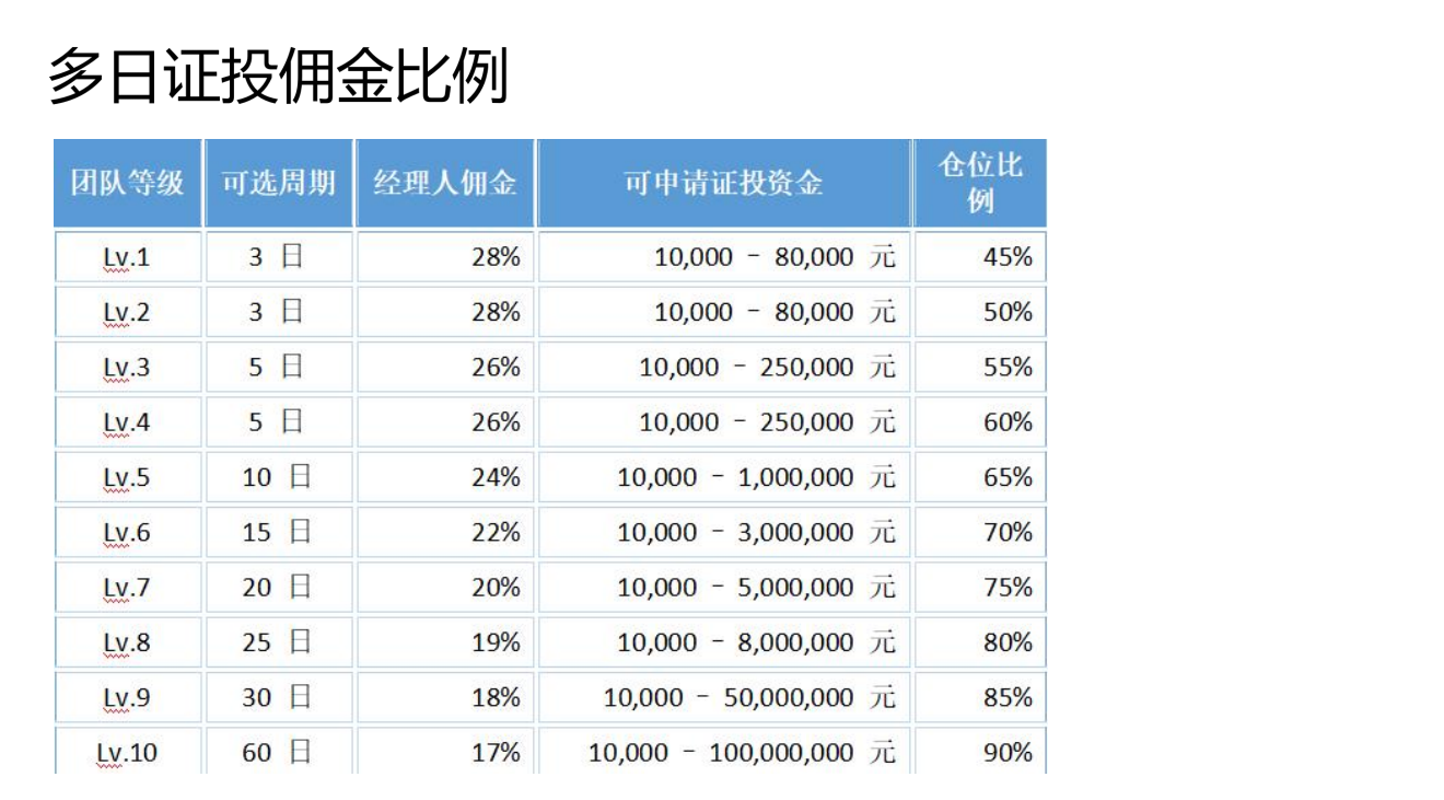 多日证投策略解析 多日证投是指客户在一个交易周期内(3~90个交易日),将资金托管给经理人统一操作。周期越长,分成比例越低,客户实际到手收益越高