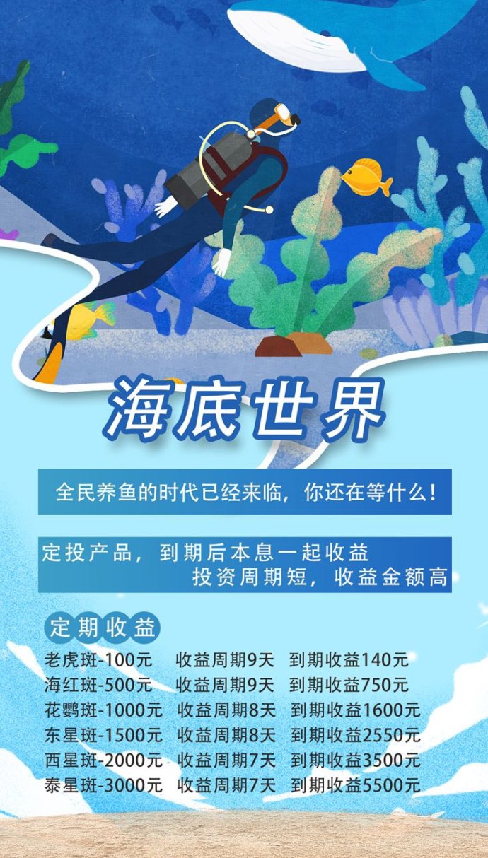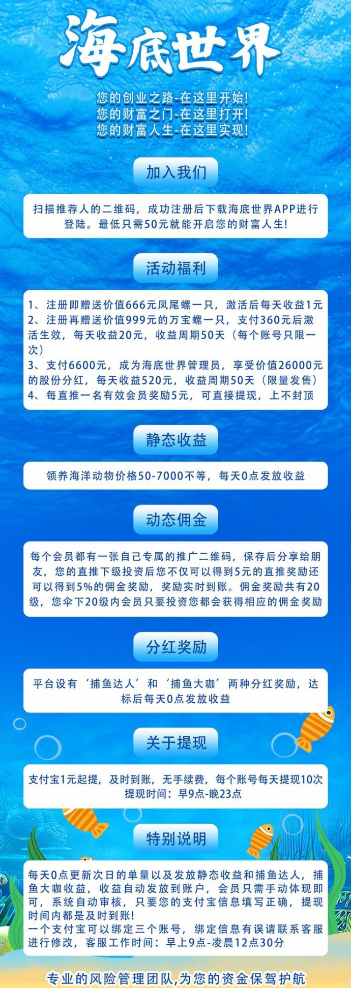 用户可以通过分享专属联接来推广海底世界。一级好友产生的收溢平台返还15%,二级好友返还10%,三级好友返还5%。此外,每邀5名好友注测并完成操作,用户还可获得当天营业额的2%作为分成。推广奖励将实时计入仗户,让用户在赚取自己收溢的同时,也能轻松通过团队推广获得额外回报。