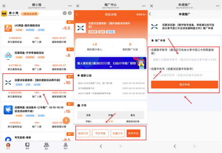 迅雷浏览器拉新操作流程已高度标准化,简便易上手。获取推广资质是第一步,以在【蜂小推】平台申请为例,在微信搜索“蜂小推”公众号并关注,点击公众号内链接下载蜂小推APP,完成注册登录(可填写官方邀请码000000),进入APP首页找到“迅雷浏览器”项目入口,按要求填写信息提交推广申请,系统自动审核,通过后即可获取专属推广口令,全程在手机端就能便捷搞定。