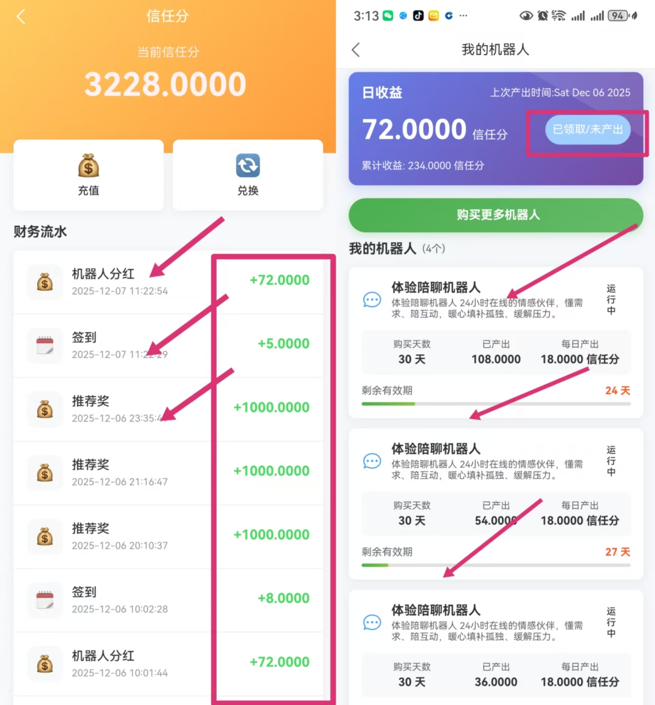 ①零撸会员每天领取陪聊机器人奖励,和签到奖励和,爆粉红包+团队加成!
