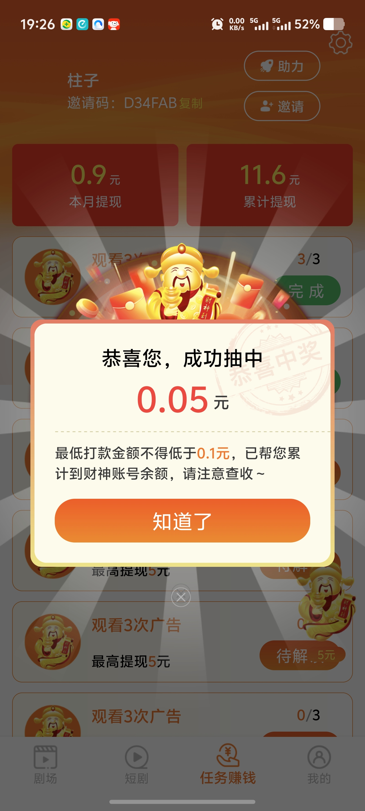 正文 闲映极速版看财神抽大奖邀请好友拿财神分红! zhuzi123 V评论者 /前天 /0 评论 /93 阅读 0127 任务赚钱每三个参与一次财神抽奖保底0.1最高五元每天30轮解锁短剧获得现金红包0.1-0.8不等顶包一米邀请好友拿财神分红好友解锁短剧你获得一比一提成财神抽奖也是一样投诉/删帖